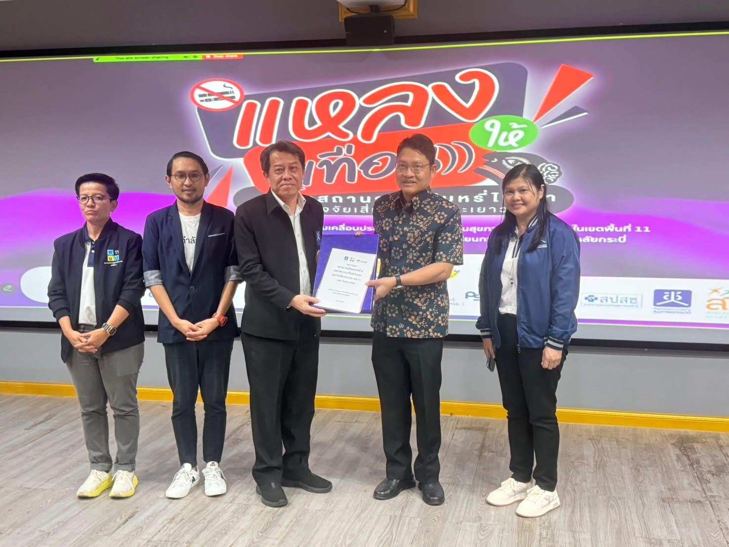 สำนักงานคณะกรรมการสุขภาพแห่งชาติ (สช.) คณะกรรมการเขตสุขภาพเพื่อประชาชน เขต ๑๑ (กขป. ๑๑) โดยศูนย์สร้างสรรค์สื่อเพื่อเด็กเยาวชนและครอบครัว (สโมสรยกกำลังสุข) ร่วมกับภาคี จัดเวทีจับตาสถานการณ์บุหรี่ไฟฟ้าในพื้นที่ภาคใต้ และเวทีบันทึกความร่วมมือสู่การพัฒนากลไกบูรณาการภารกิจการขับเคลื่อนประเด็นภัยคุกคามด้านสุขภาพ (บุหรี่ไฟฟ้า) ในเขตพื้นที่ 11