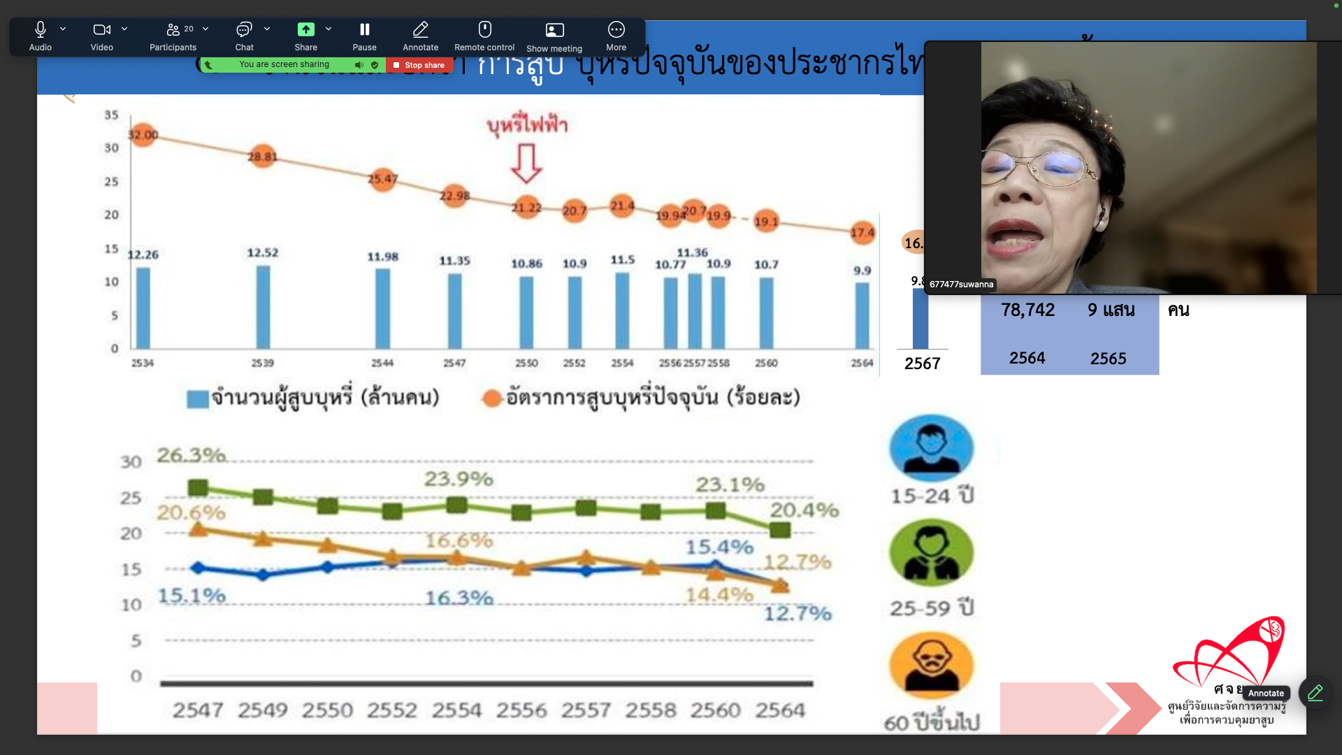 ศ.พญ.สุวรรณา เรืองกาญจนเศรษฐ์ รองผู้อำนวยการศูนย์วิจัยและจัดการความรู้เพื่อการควบคุมยาสูบ ได้นำเสนอข้อมูลสถานการณ์บุหรี่ไฟฟ้าของประชากรไทย พ.ศ. 2567 ซึ่งพบว่าพื้นที่ภาคใต้มีแนวโน้มการใช้เพิ่มขึ้น โดยเฉพาะในกลุ่มเยาวชน พร้อมชี้ชัดถึงอันตรายของสารเสพติดและสารพิษในผลิตภัณฑ์ดังกล่าว