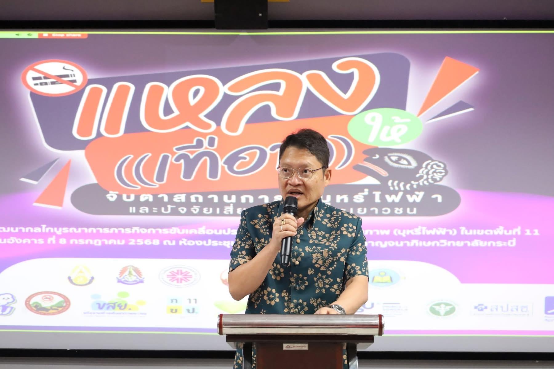 เมื่อวันที่ 8 กรกฎาคม 2568 ณ ห้องประชุม Auditorium โรงเรียนกาญจนาภิเษกวิทยาลัยกระบี่ ได้มีการจัดเวที “แหลงให้เทือน : เวทีจับตาสถานการณ์บุหรี่ไฟฟ้าและปัจจัยเสี่ยงในพื้นที่ภาคใต้” โดยมีเป้าหมายสำคัญในการพัฒนากลไกบูรณาการภารกิจการขับเคลื่อนประเด็นภัยคุกคามด้านสุขภาพ (บุหรี่ไฟฟ้า) ในเขตสุขภาพเพื่อประชาชน เขต 11