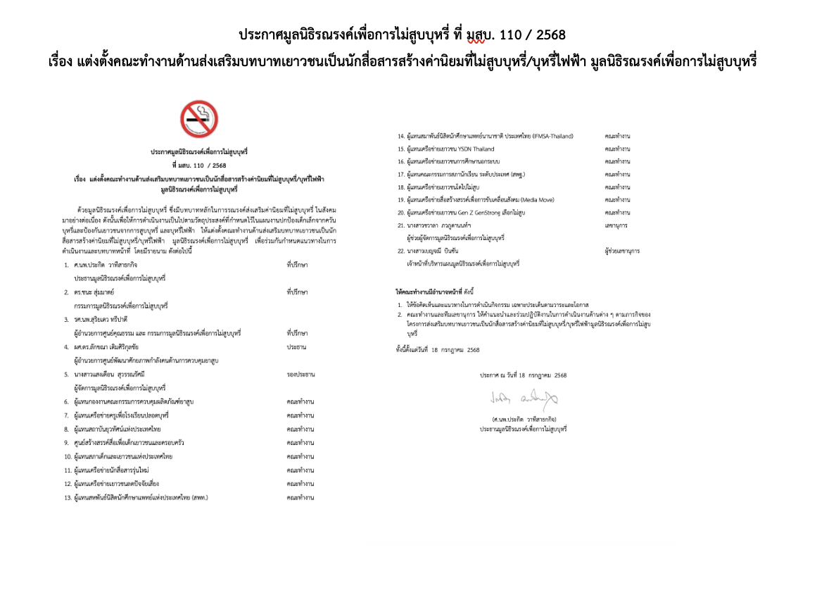 วันพุธที่ 17 กันยายน 2568 มูลนิธิรณรงค์เพื่อการไม่สูบบุหรี่ จัดการประชุมคณะทำงานด้านส่งเสริมบทบาทเยาวชนเป็นนักสื่อสารสร้างค่านิยมที่ไม่สูบบุหรี่/บุหรี่ไฟฟ้า ครั้งที่ 1/2568 ณ ห้องประชุมภักดี 1 โรงแรมอะบลูม เอ็กซ์คลูซีฟ เซอร์วิส อพาร์ทเมนท์ ซอยพหลโยธิน 3 พญาไท กรุงเทพฯ โดยการสนับสนุนจาก สำนักงานกองทุนสนับสนุนการสร้างเสริมสุขภาพ (สสส.)