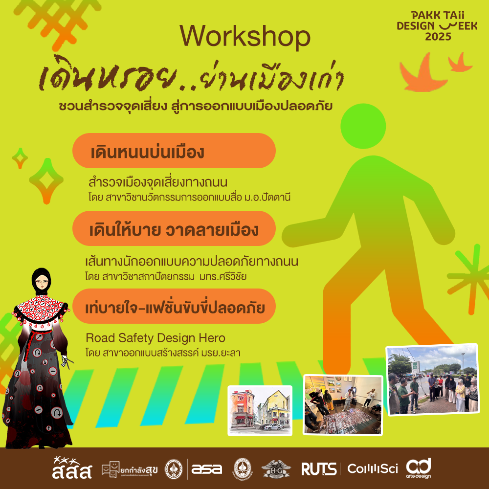 ภายใต้เทศกาลงานออกแบบปักษ์ใต้ 2568 – South Paradise (มาใต้ บายใจให้ถึงหวัน) โครงการ Design for Change: คนรุ่นใหม่ร่วมออกแบบชุมชนสร้างความปลอดภัยทางถนน ได้จัดกิจกรรม Workshop “เดินหรอยย่านเมืองเก่า ชวนสำรวจจุดเสี่ยง สู่การออกแบบเมืองปลอดภัย” เพื่อเปิดพื้นที่ให้เยาวชนและคนทั่วไปได้เรียนรู้และทดลองใช้กระบวนการคิดเชิงออกแบบ (Design Thinking) มาสำรวจ วิเคราะห์ และออกแบบคำตอบใหม่ ๆ ให้กับโจทย์ใหญ่ของสังคม — การลดอุบัติเหตุทางถนน