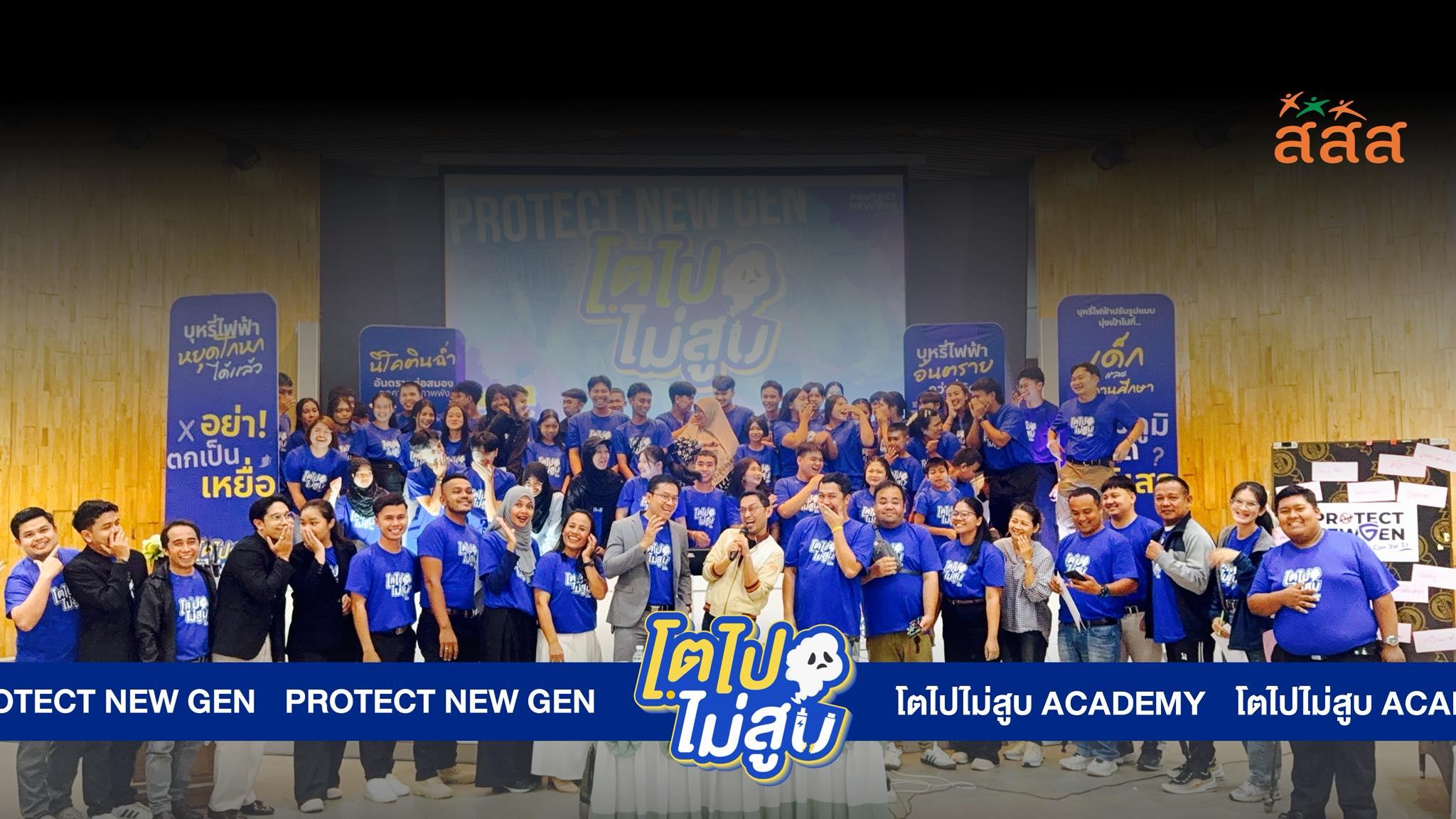 สสส. โดยสโมสรยกกำลังสุข ศูนย์สร้างสรรค์สื่อเพื่อเด็กฯ จัดเสริมทักษะแกนนำเยาวชนและครูใน 14 จังหวัดภาคใต้ จำนวน 20 โรงเรียน จัดอบรมเชิงปฏิบัติการ “โตไปไม่สูบ Academy” ซึ่งถือเป็นหลักสูตรที่ออกแบบขึ้นเพื่อพัฒนาเยาวชนให้เป็นแกนนำและนักนวัตกรทางสังคมในการขับเคลื่อนโรงเรียนปลอดภัยจากบุหรี่ไฟฟ้า