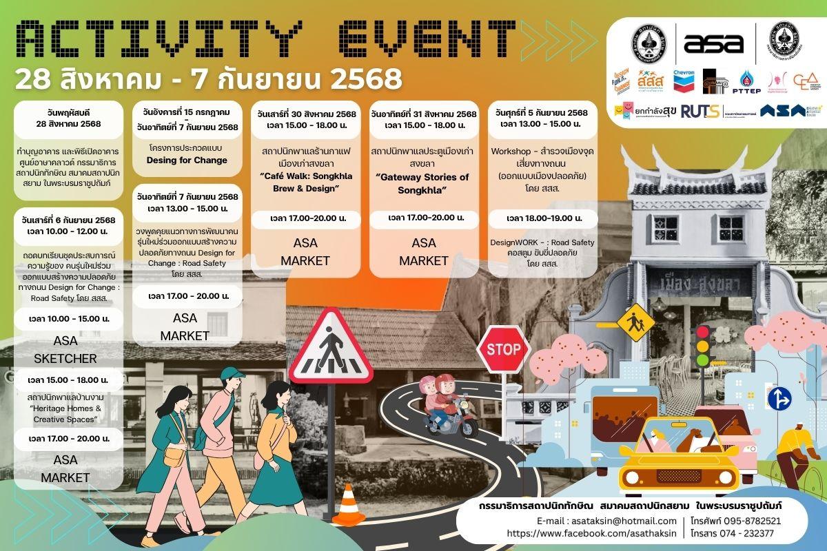 Workshop : เดินหรอยย่านเมืองเก่า ชวนสำรวจจุดเสี่ยง สู่การออกแบบเมืองปลอดภัย จุดที่ 1) เดินหนนบ่นเมือง - สำรวจเมืองจุดเสี่ยงทางถนน บริเวณเส้นทางเมืองนครใน โดยสาขาวิชานวัตกรรมการออกแบบสื่อ คณะวิทยาการสื่อสาร ม.อ.ปัตตานี จุดที่ 2) เดินให้บาย วาดลายเมือง – เส้นทางนักออกแบบความปลอดภัยทางถนน บริเวณเส้นทางเมืองนครนอก โดยสาขาวิชาสถาปัตยกรรม คณะสถาปัตยกรรมศาสตร์ มทร.ศรีวิชัย จุดที่ 3) เท่บายใจ-แฟชั่นขับขี่ปลอดภัย Road Safety Design Hero ในอาคาร Asa Cloud โดยสาขาออกแบบสร้างสรรค์ คณะมนุษยศาสตร์และสังคมศาสตร์ มรย.ยะลา |
