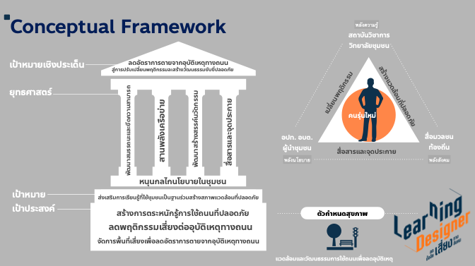 ภาพกรอบแนวคิดการดำเนินงานของการชวนคนรุ่นใหม่มาร่วมออกแบบชุมชนลดปัจจัยเสี่ยงทางสังคมเพื่อสร้างความปลอดภัยทางท้องถนน (Conceptual Framework)